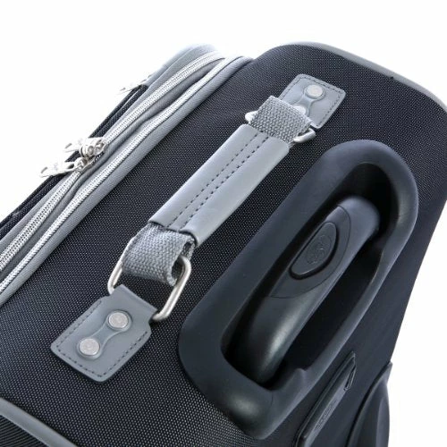 Details: OE-8825-BK Color: Black Pictured in Black Features: -Constructed of two-tone polyester. -Double wheels 360 spin allows free movement in all directions. -U tube push button retractable handle. -Expanding feature adds 20 percent more packing capacity. -Front zipper pocket and internal zipper mesh pocket for extra packing capacity. -Interior zipper pocket and dual buckle tie-belt. -Built-in dual shoe pocket. -Full interior lining. -EVA foamed front panel. -Dimensions: 28” H x 19” W x 12” D.