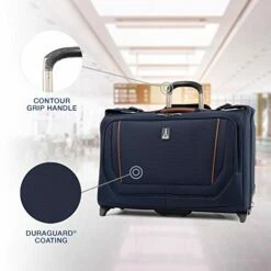 - 3 external zippered pockets,1 interior mesh pocket, and locking telescoping handle that extends to two heights